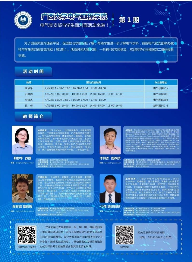 4月22日至4月24日,我院电气系党支部举行第一届党支部与学生面对面活动,为师生创造沟通新平台,帮助学生进一步了解电气学科。本次活动有黎静华、阳育德、李佩杰、代伟四位老师参与。