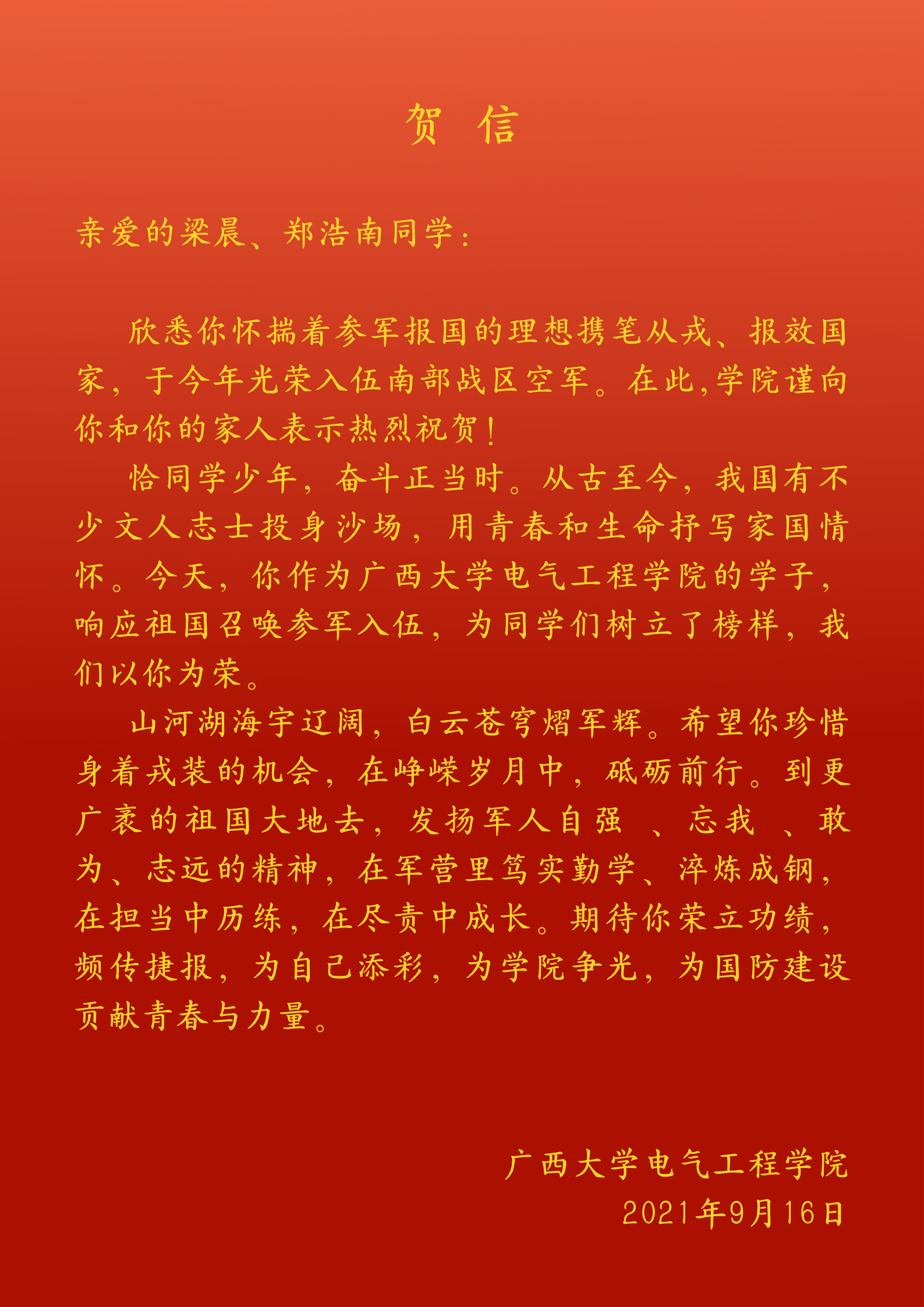 2021年秋季学期,开云kaiyun登录入口学生梁晨同学和郑浩南同学响应祖国召唤参军入伍。其中,梁晨入伍南部战区空军,郑浩南入伍战略支援部队,为表示祝贺,学院给两位同学发了贺信。
