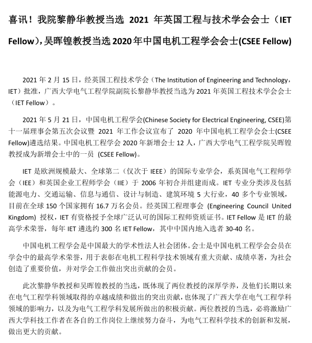 喜讯!我院黎静华教授当选2021年英国工程与技术学会会士(IET Fellow),吴晖锽教授当选2020年中国电机工程学会会士(CSEE Fellow)1