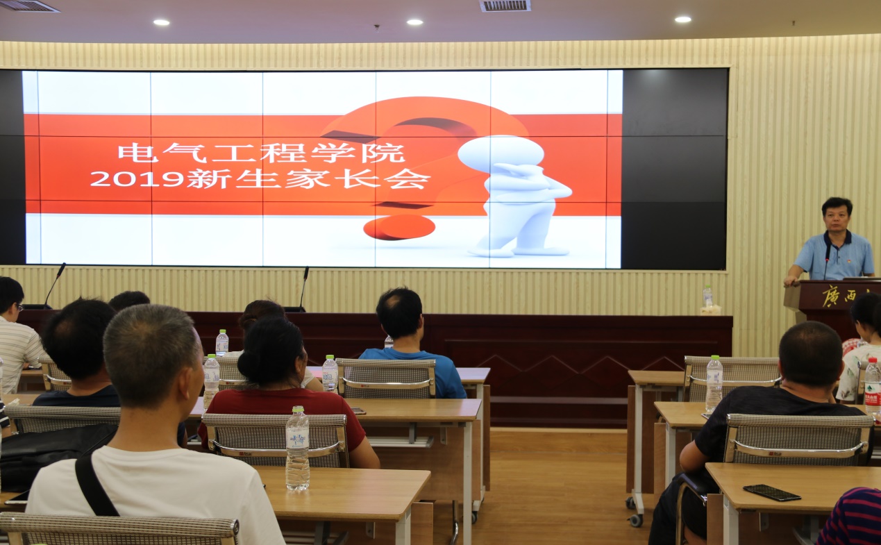下午16:00,电气工程学院在新闻大楼一楼东报告厅召开了2019级新生家长会。学院党委副书记梁志坚老师、学工组老师、19级新生班主任及200多位新生家长参加会议。会议由党委副书记梁志坚老师主讲。