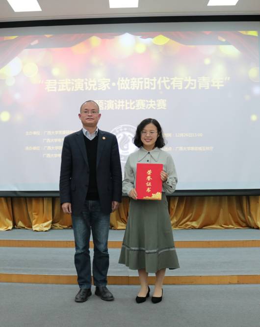 1226日,广西大学第二届“君武演说家·做新时代有为青年”主题演讲比赛在广西大学君武楼玉林厅举行。来自8个学院的10名选手,在决赛中通过慷慨激昂的演讲,展现了新时代广西大学青年学子的风采。最终,比赛角逐出一等奖1名,二等奖2名,三等奖3名。