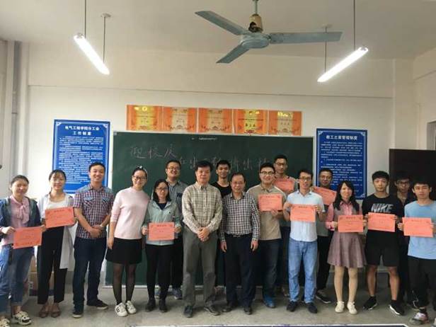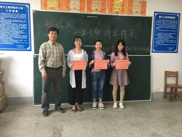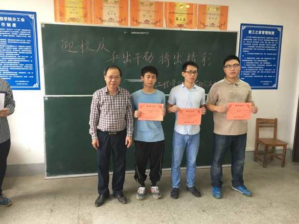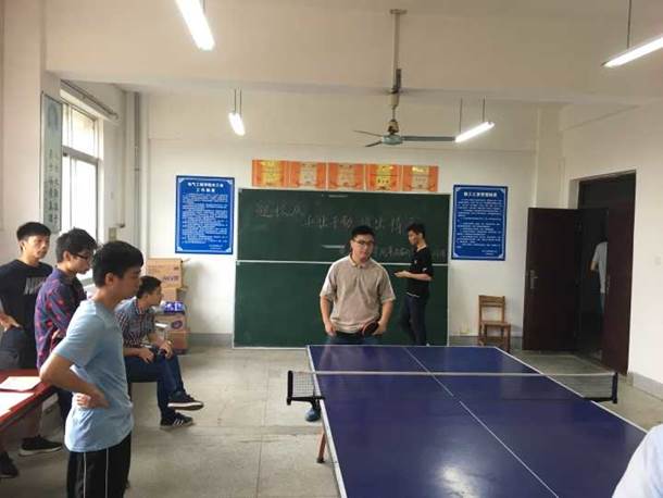 值广西大学90周年校庆来临之际,上午9点,第五届电气工程学院研究生乒乓球赛男单决赛在学院205乒乓球室进行,电气工程学院党委书记梁京章老师、党委副书记梁志坚老师、学工组辅导员孙晓黎老师作为嘉宾观看比赛并颁奖。