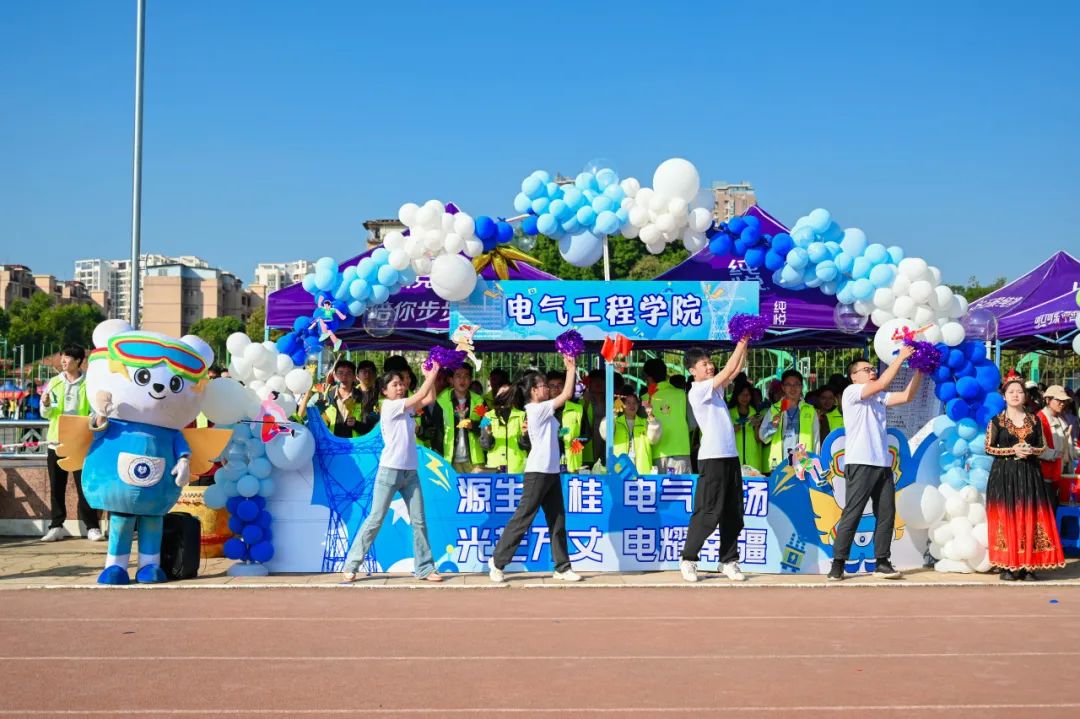 开幕式上,伴随主持人激昂的解说,我院吉祥物电电熊和意气风发的电气学子们阔步走来。他们或身着军装或身着民族服饰和专业特色服装,神采奕奕,步履坚定,志气高扬,展现了电气学子的青春风采和蓬勃朝气。