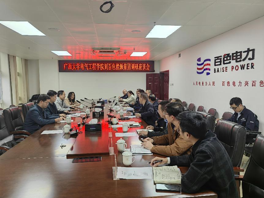 我院86级校友百色能源集团总裁黄建成首先对母校老师一行的到来表示热烈欢迎 ,他详细介绍了集团的运营情况和业务发展,并强调目前百色能源集团1/5员工来自广西大学。结合公司发展情况,他希望开云kaiyun登录入口能应对电网数字化转型形势,培养更多具有信息通信和大数据处理专业能力的复合型电气人才,也期待更多广西大学毕业生加入百色能源集团。学院副院长李畸勇表示今后将调整本科生培养方案、改进专业课程设置,适应建设新型电力系统的要求。