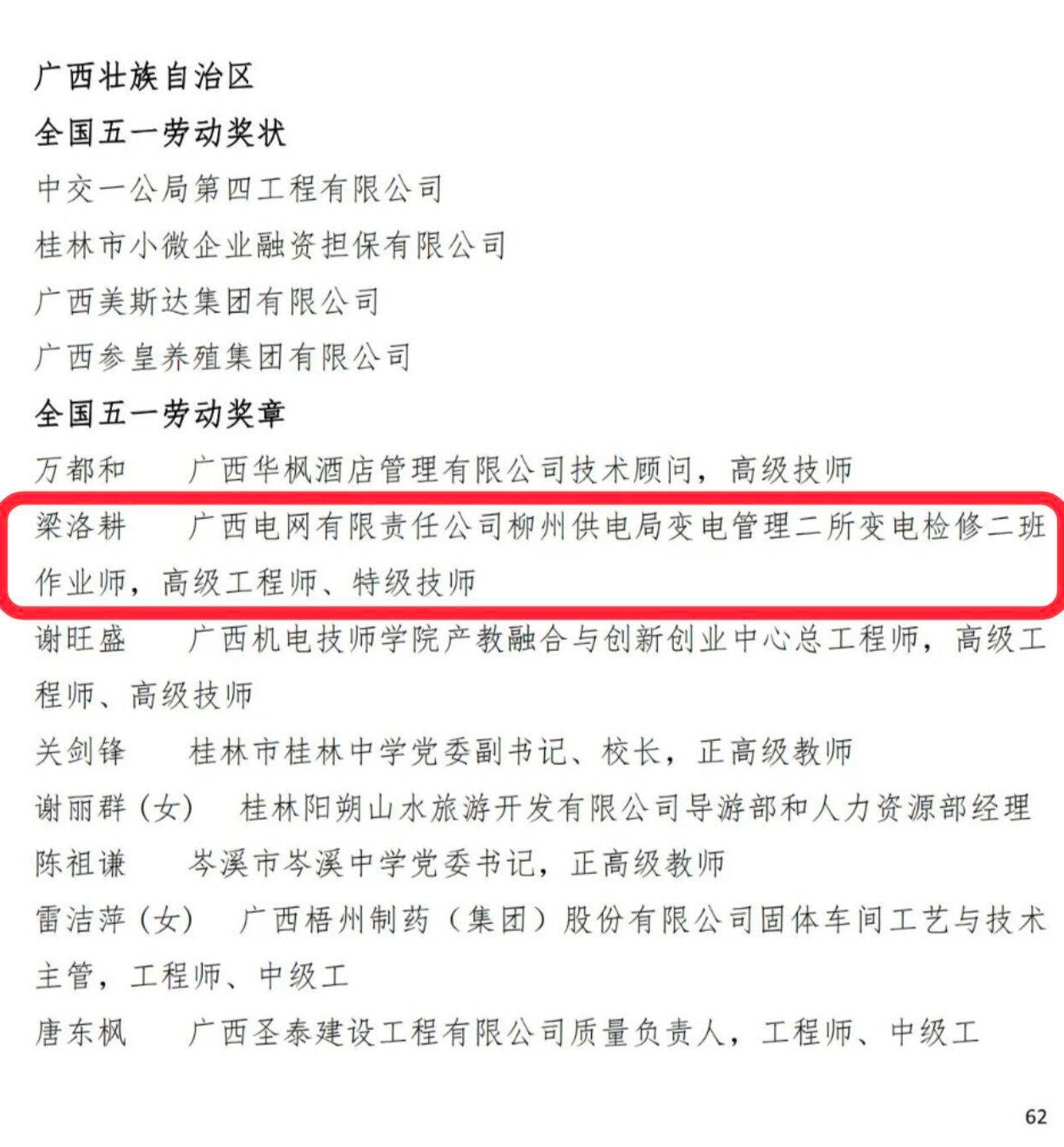 梁洛耕,广西大学电力系统及其自动化专业86级校友,现任广西电网有限责任公司柳州供电局变电管理二所变电检修二班作业师,高级工程师、特级技师。他扎根电力生产一线30余年,凭借扎实的理论功底和高超的专业技能,在成千上万次的现场工作实践中,练就了一门检修变压器“隔空把脉”的高超技能,凭借试验报告、现场图片、运行声音等即可精准研判变压器故障原因,并提出最佳的处理方案。