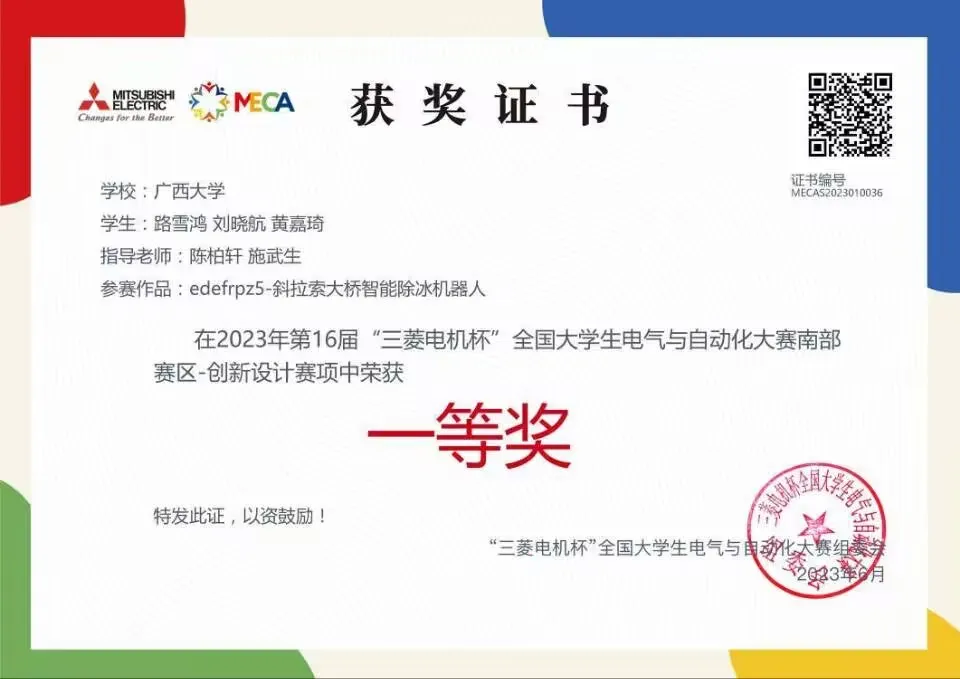 “三菱电机杯”全国大学生电气与自动化大赛南部赛区一等奖