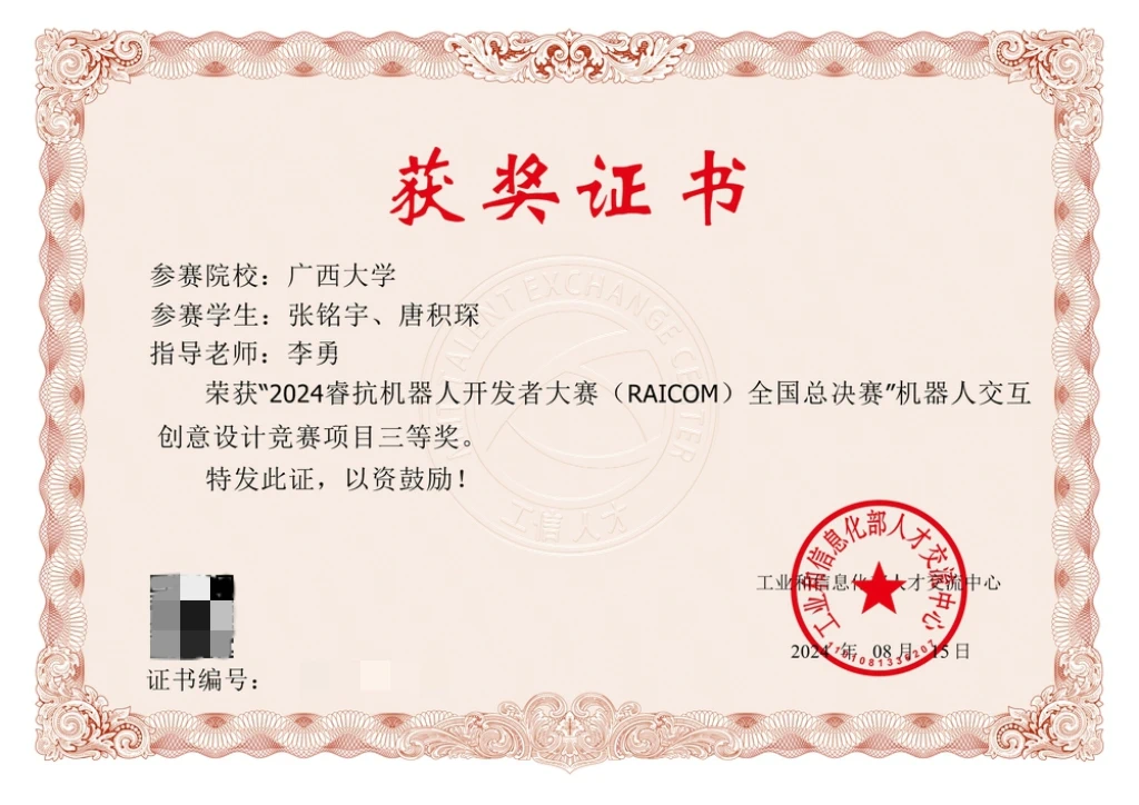 在由工业和信息化部人才交流中心主办的“2024睿抗机器人开发者大赛(RAICOM)全国总决赛”中,我院电创221班张铭宇同学、电自228班唐积琛同学在机器人交互创意设计竞赛项目中荣获全国三等奖;电自228班孙在润同学、自动化231班向姝荫同学则在智能生活创意设计竞赛项目中获得全国三等奖。此外,在该赛事广西赛区总决赛中,我院学生表现优异,获得3项一等奖和1项三等奖。