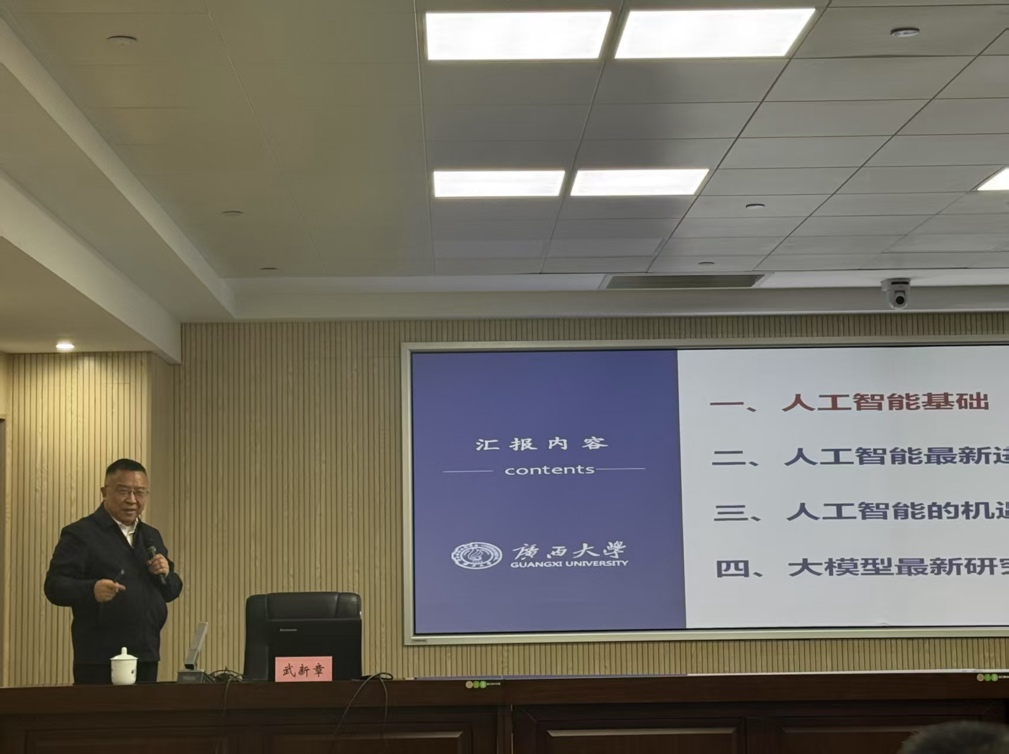 交流期间,武新章教授与广西商务厅各部门围绕人工智能基础、人工智能最新进展、人工智能的机遇与挑战、大模型最新研究进展与预期应用评估等议题进行了深入探讨。