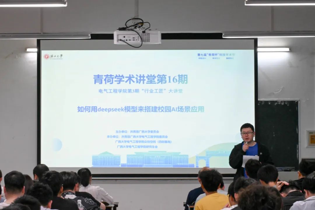 为引导同学们学习人工智能领域前沿,了解校园AI场景应用的搭建方法及其实践意义,3月27日晚上,由共青团广西大学委员会主办,电气工程学院团委、众创空间联合承办的第16期青荷学术讲堂暨第3期电气工程学院“行业工匠”大讲堂在304教室举行。 此次讲座邀请到中国AI企业家百强年会行业导师张亮和广西码农信息科技有限公司技术总监何锋,为我院师生作题为“如何用DeepSeek模型来搭建校园AI场景应用”的讲座。讲座由学院兼职团委副书记李勇老师主持,本科生和研究生共计100余人参加活动。 张亮老师围绕AI通识、DeepSeek大模型简介及其本地化部署、校园场景下智能体的搭建与应用展开讲授。他首先从人工智能的发展历程切入,介绍了控制论、专家系统、机器学习、深度学习等关键技术突破的重要节点。他表示,近年来,OpenAI开发的ChatGPT引领了AI技术的新潮流,其基于大规模预训练语言模型(如GPT-3.5、GPT-4),展现了强大的自然语言理解与生成能力,推动了AI在人机交互、内容创作、教育等多个领域的应用。 随后,张亮老师详细阐述了AI在学习、办公、编程和职业发展中的实际作用和应用方式,并期待AI成为同学们校园生活的智能助手。 对于AI智能体与普通AI模型的区别,何锋老师展开了详细的讲解。他表示,普通的AI模型通常是被动响应用户的输入,而AI智能体则具备自主决策、长期记忆、任务规划等能力,能够在不同环境下执行更复杂的任务。例如,基于大语言模型(LLM)的智能体可以整合搜索、代码执行、自动化任务处理等功能,使其具备更强的自主性和交互能力。 在深入探讨AI智能体的实际应用后,何锋老师向大家展示了DeepSeek AI的本地部署方式。同时介绍了如何结合Ollama等工具,在本地高效部署DeepSeek,并详细讲解了如何根据电脑硬件的能力选择合适的 DeepSeek 版本,以优化推理性能。 本期青荷学术讲堂暨第3期电气工程学院“行业工匠”大讲堂,不仅拓展了同学们解决工程问题的视野和思路,更通过产学研深度融合的方式进一步明晰了行业技术发展方向,为同学们未来的专业学习与职业发展提供前瞻性指引。
