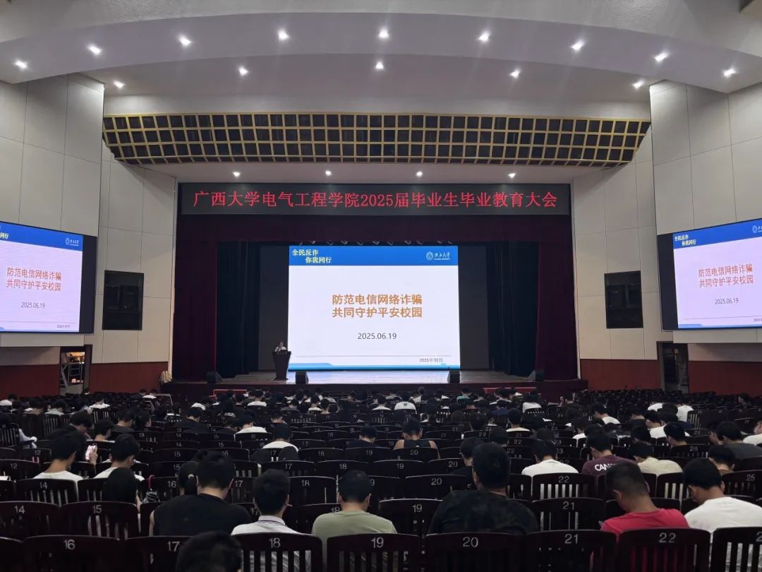 为做好学院2025届毕业生毕业教育与离校相关工作,增强毕业生爱校荣校、诚信感恩、反诈防诈、廉洁从业意识,6月19日下午,我院在大礼堂举行2025届毕业生毕业离校教育大会。我院党委副书记李琼莹,团委书记蒋冬连,团委副书记李娟、冯敏,辅导员何惠榕出席会议,我院2025届全体毕业生参加会议。