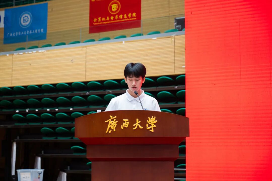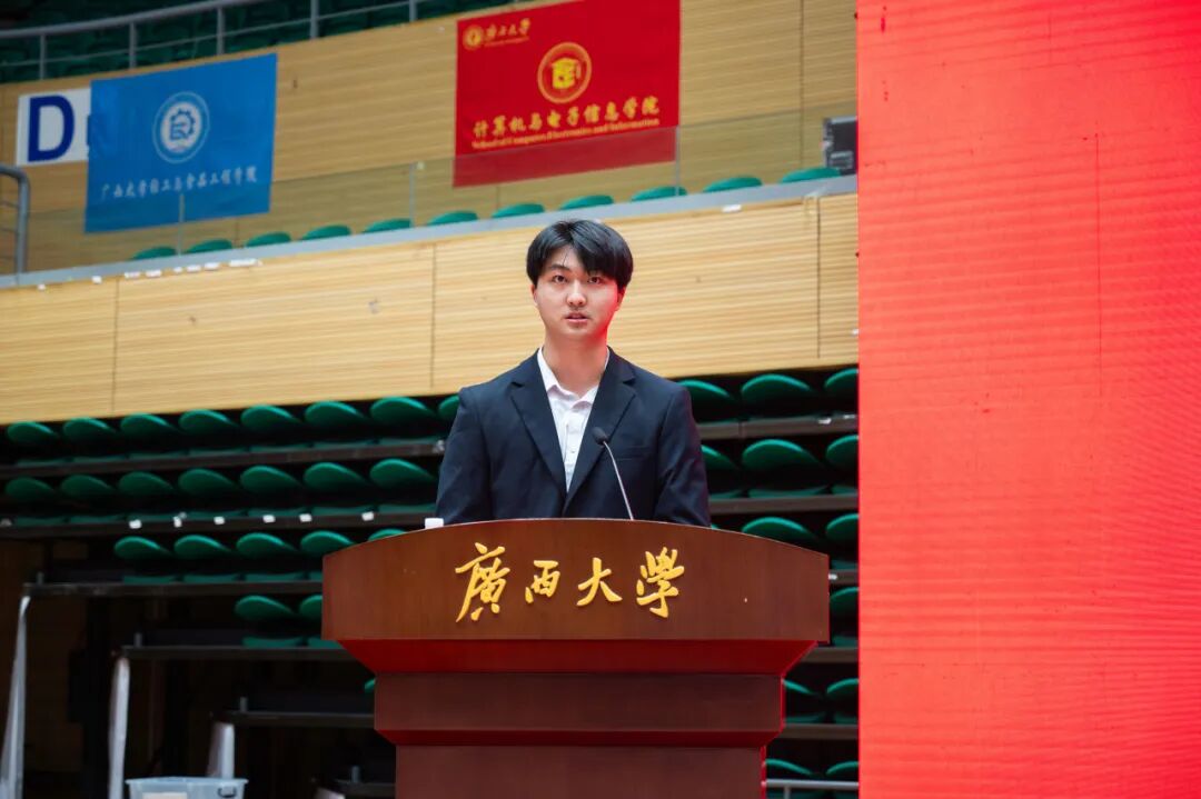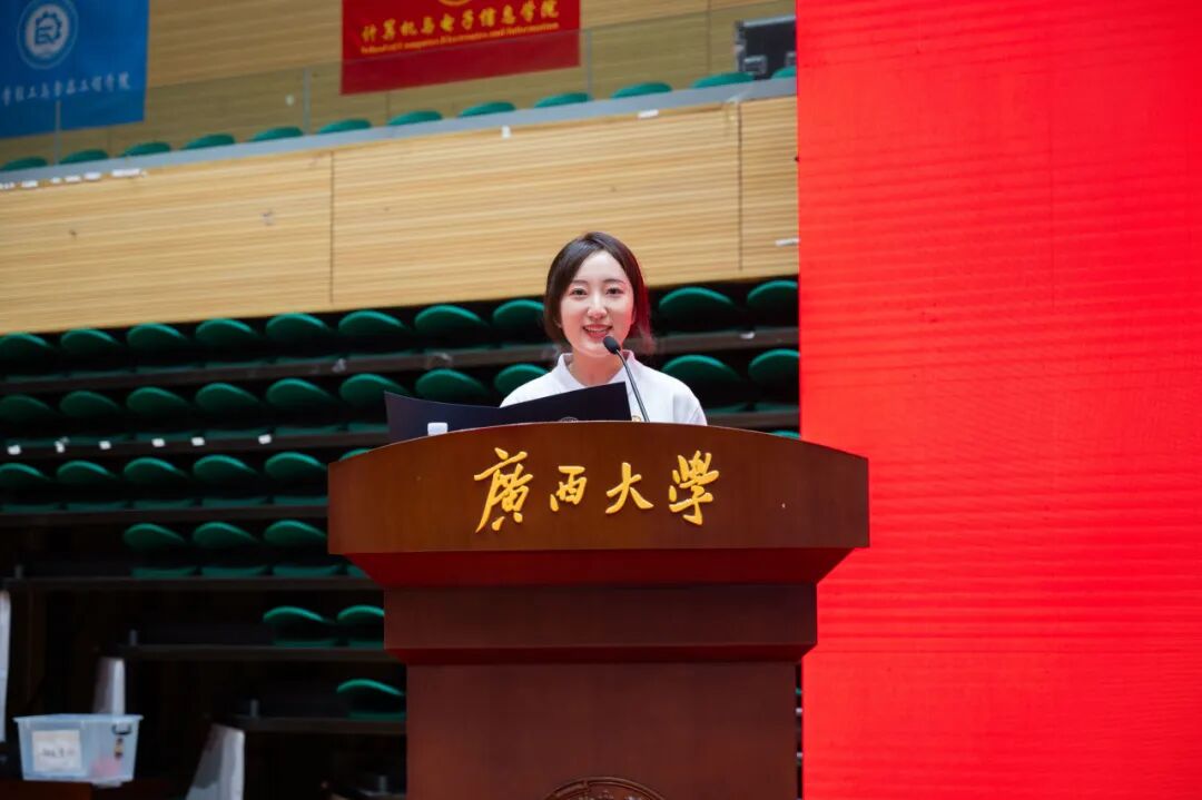 2025级硕士研究生李真瑜、2025级电气工程及其自动化留学生阮孟桥(越南籍)和2022级刘佳和分别作为新生代表和老生代表发言。李真瑜同学分享了自身支教中的责任与体悟,表达了将依托学院资源,把个人研究与国家“双碳”战略等发展需求相结合的决心,倡议新生传承西大精神、深耕专业、心怀家国,为民族复兴贡献青春力量。阮孟桥同学表达了对中国文化和先进技术的向往,表示未来四年将积极与同学们交流互动、共同进步,继续传承中越“同志加兄弟”的深厚情谊,努力成长为连接中国与越南的纽带使者。刘佳和同学结合其三年来的学习科研经历,鼓励新生志存高远、善用平台、勇于创新、常怀感恩,以实际行动回馈社会。