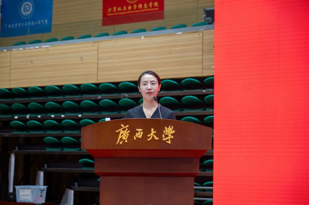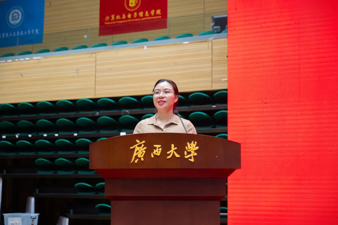 自动化系蒋燕老师分享了对大学生活的深刻感悟,并从三方面鼓励同学们:一是要永葆好奇、求知若渴,明确大学不是奋斗终点而是探索起点,需带着疑问在课堂、实验室、图书馆中探寻电气与自动化领域知识;二是要德才兼备、行稳致远,强调学电研电先修德做人,坚守科研真实底线与做人原则,这是未来立足的坚实“底气”;三是要独立思考且协作共赢,既要珍惜独处沉淀的时光,也要主动与他人联结,在团队协作中突破成长。最后,她祝愿全体新生“满电启航,稳定续航”,成长为优秀的“西大电气人”,以青春奋斗点亮时代光芒。
