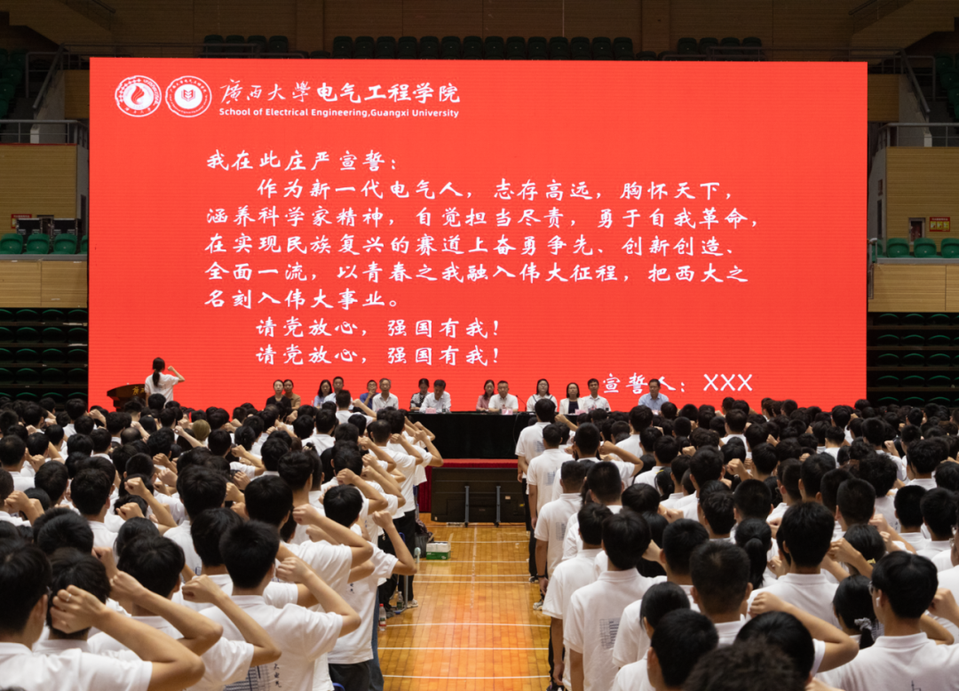 在学院领导老师的共同见证下,全体新生举起右拳,以铿锵有力的声音集体宣誓。