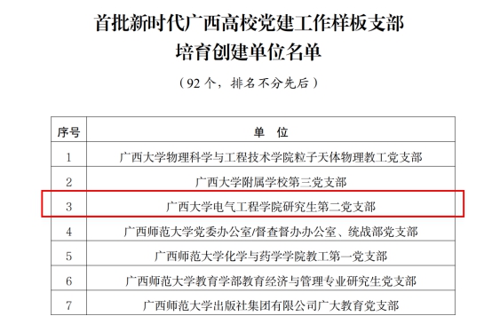 近日,自治区党委教育工委公布了首批新时代广西高校党建示范创建和质量创优工作、“双带头人”教师党支部书记工作室培育创建单位名单。我校电气工程学院研究生第二党支部入选“广西高校党建工作样板支部”培育创建单位。