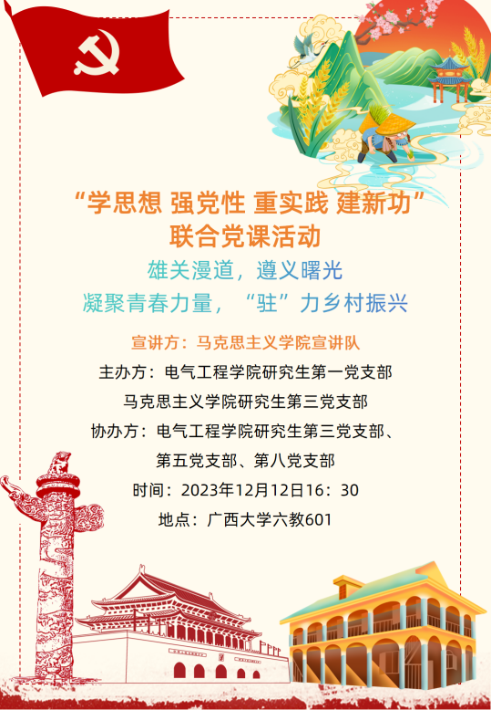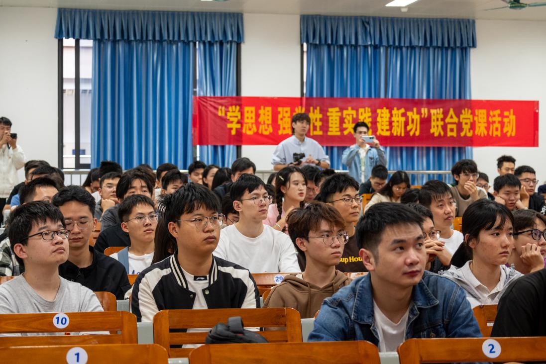 为巩固学习贯彻习近平新时代中国特色社会主义思想主题教育成果,用习近平新时代中国特色社会主义思想凝心铸魂,切实加强党支部的思想建设,2023年12月12日下午,开云kaiyun登录入口研究生第一党支部联合学院研究生第三党支部,研究生第五党支部,研究生第八党支部(以下分别简称“我院研一支部,研三支部,研五支部,研八支部”)以及马克思主义学院研究生第三党支部(以下简称“马院研三支部”)在第六教学楼601室开展“学思想、强党性、重实践、建新功”主题教育宣讲会。宣讲会由我院研一支部王伟欢同志主持,马克思主义学院宣讲队成员李宇涵和蒙佳慧同志作为主讲人,两院五支部师生党员共百余人参加。